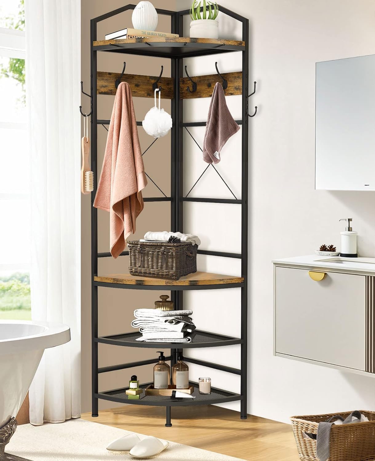 4-Tier Corner Coat Rack with Shoe Storage, Entryway Hall Tree with Bench and Hooks, Wooden Corner Clothes Rack Shoe Shelf Organizer for Home
