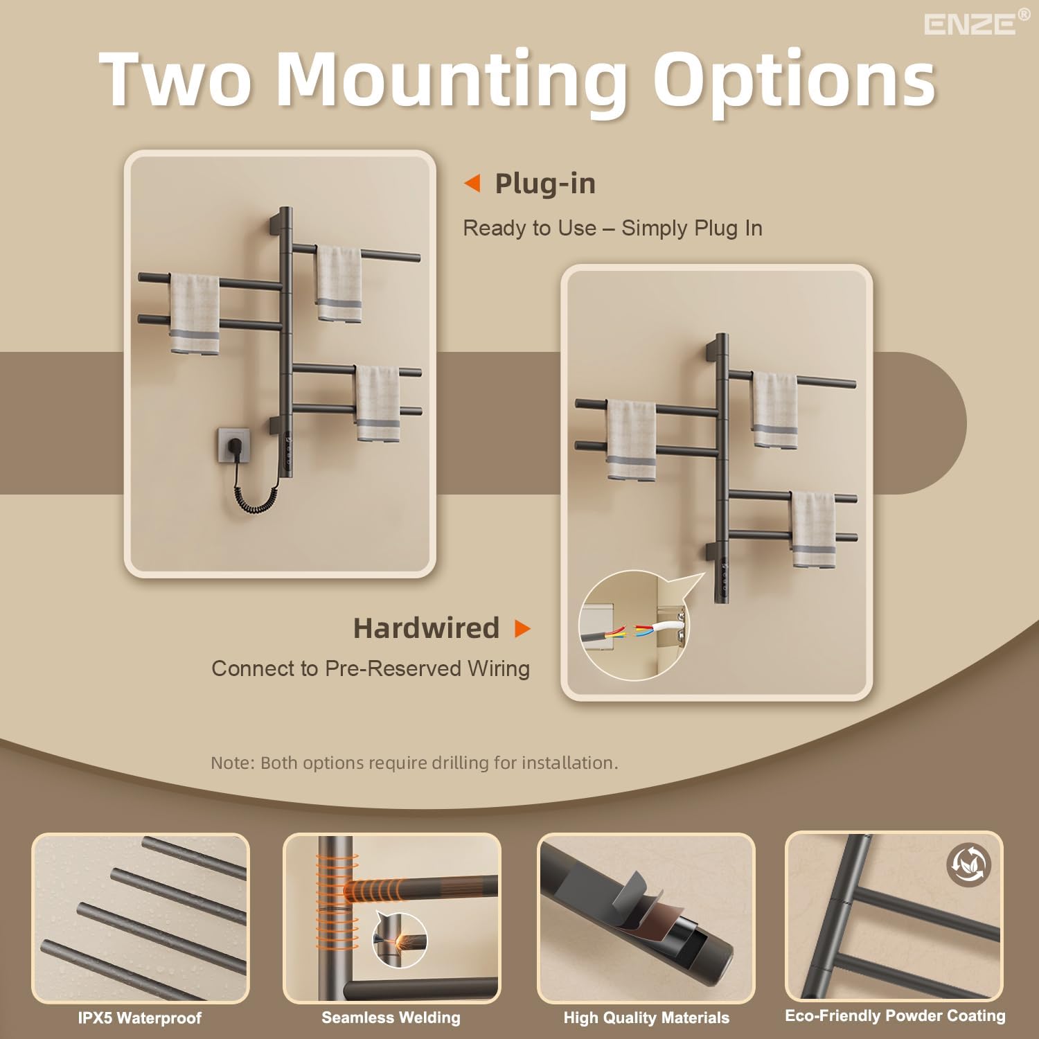 ENZE Smart Rotating Heated Towel Rack for Bathroom, 5-Bar Wall-Mounted Electric Towel Warmer with Swivel Bars, Wi-Fi App Control, 24H Timer, Stainless Steel, IPX5, Hardwired/Plug-in, Gray