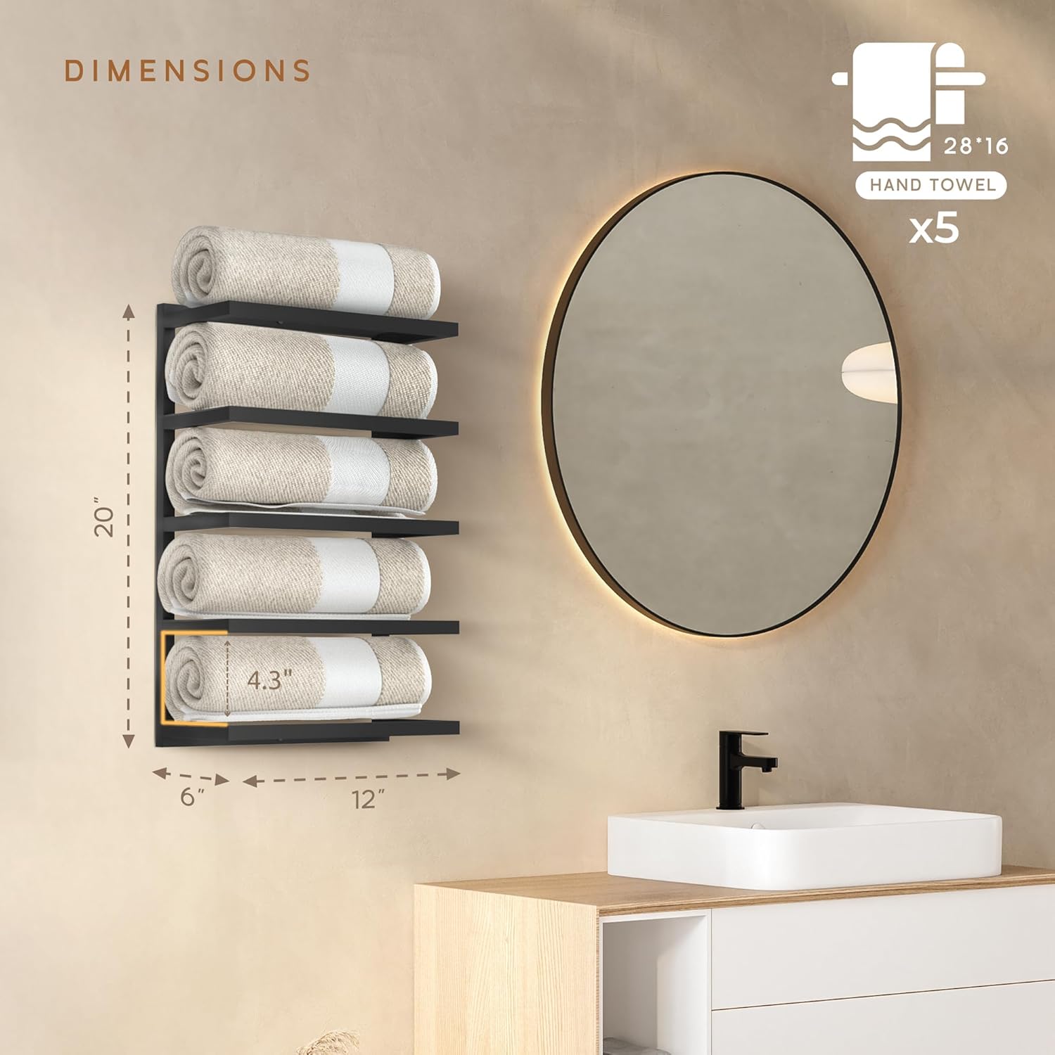 Maximize your bathroom space with the Modern 5-Tier/6-Tier Towel Rack. This sleek and functional wall-mounted black metal towel shelf is designed to organize towels and bathroom essentials while adding a stylish touch to your decor.