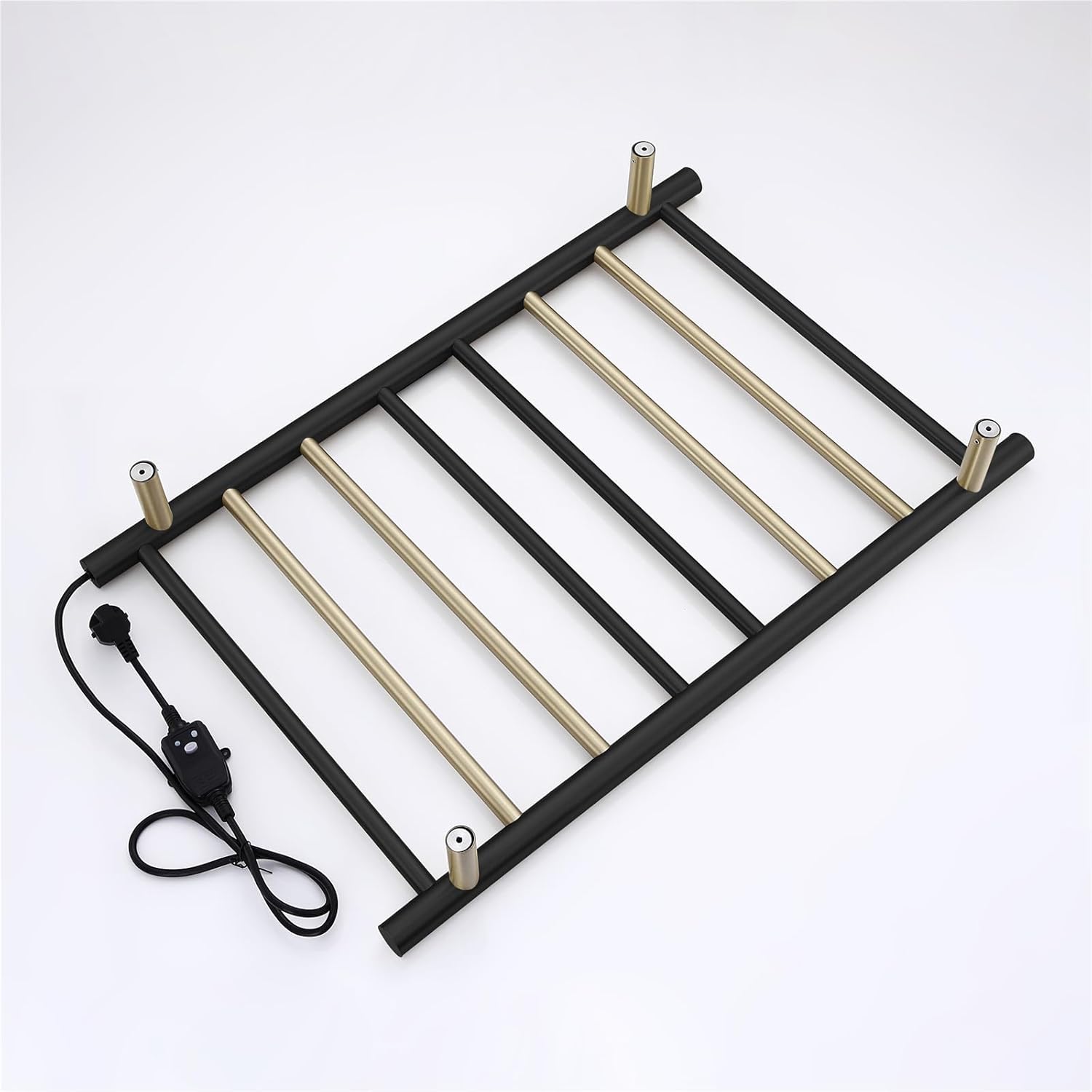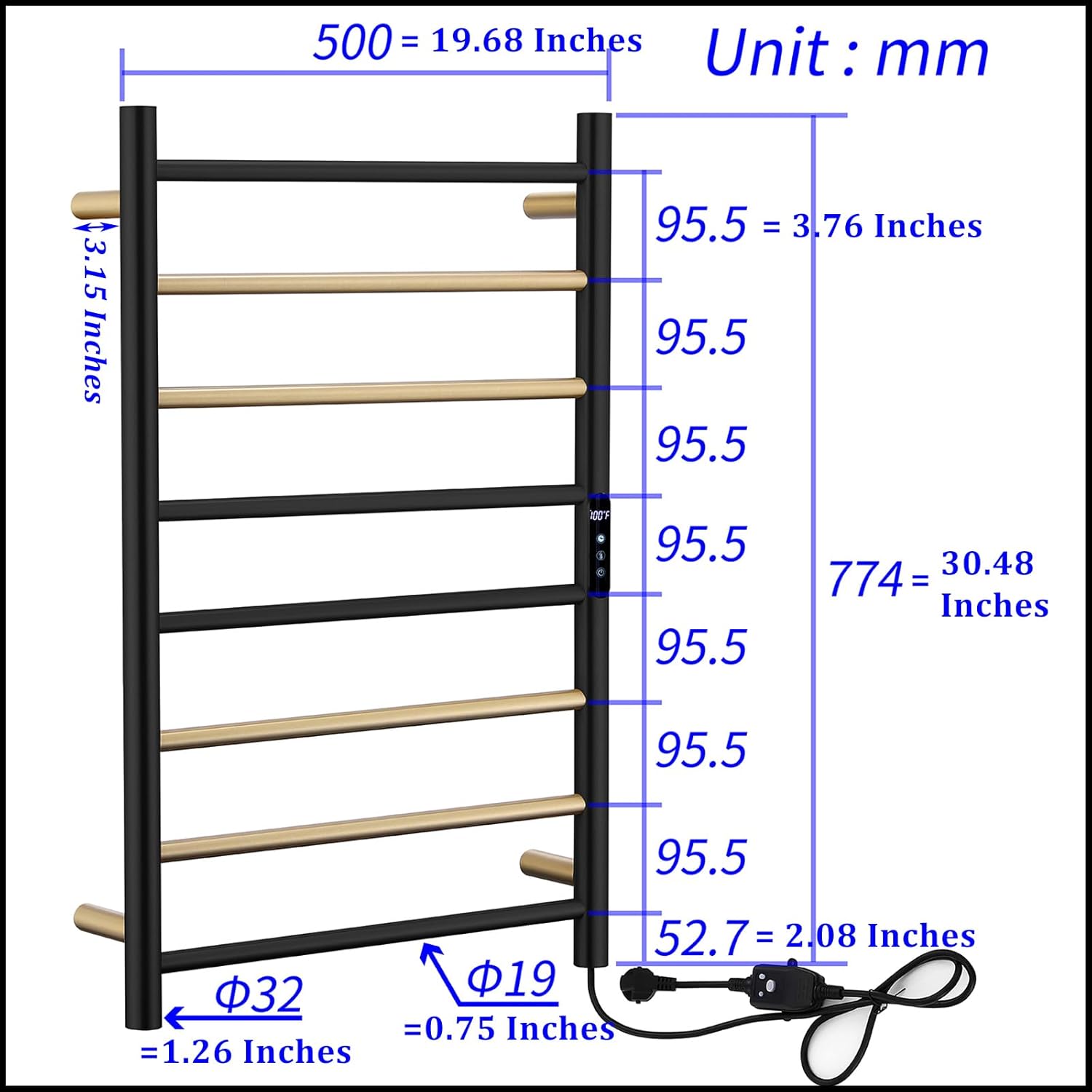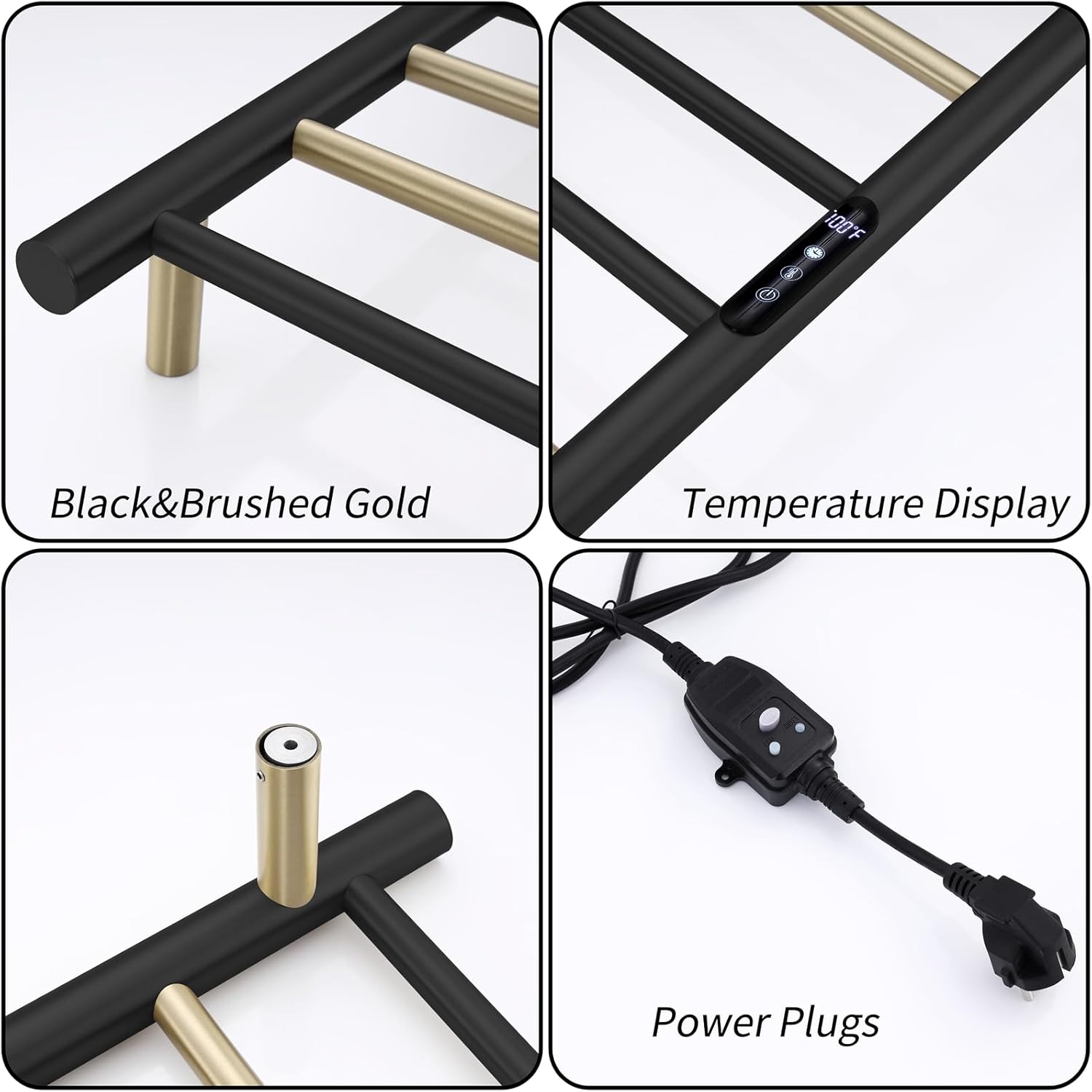 Towel Warmer Black and Brushed Gold 105 W Electric Heated Towel Rack Stainless Steel 8 Bar Towel Heater with Intelligent Touch Screen Timer, Wall Mounted, Plug-in