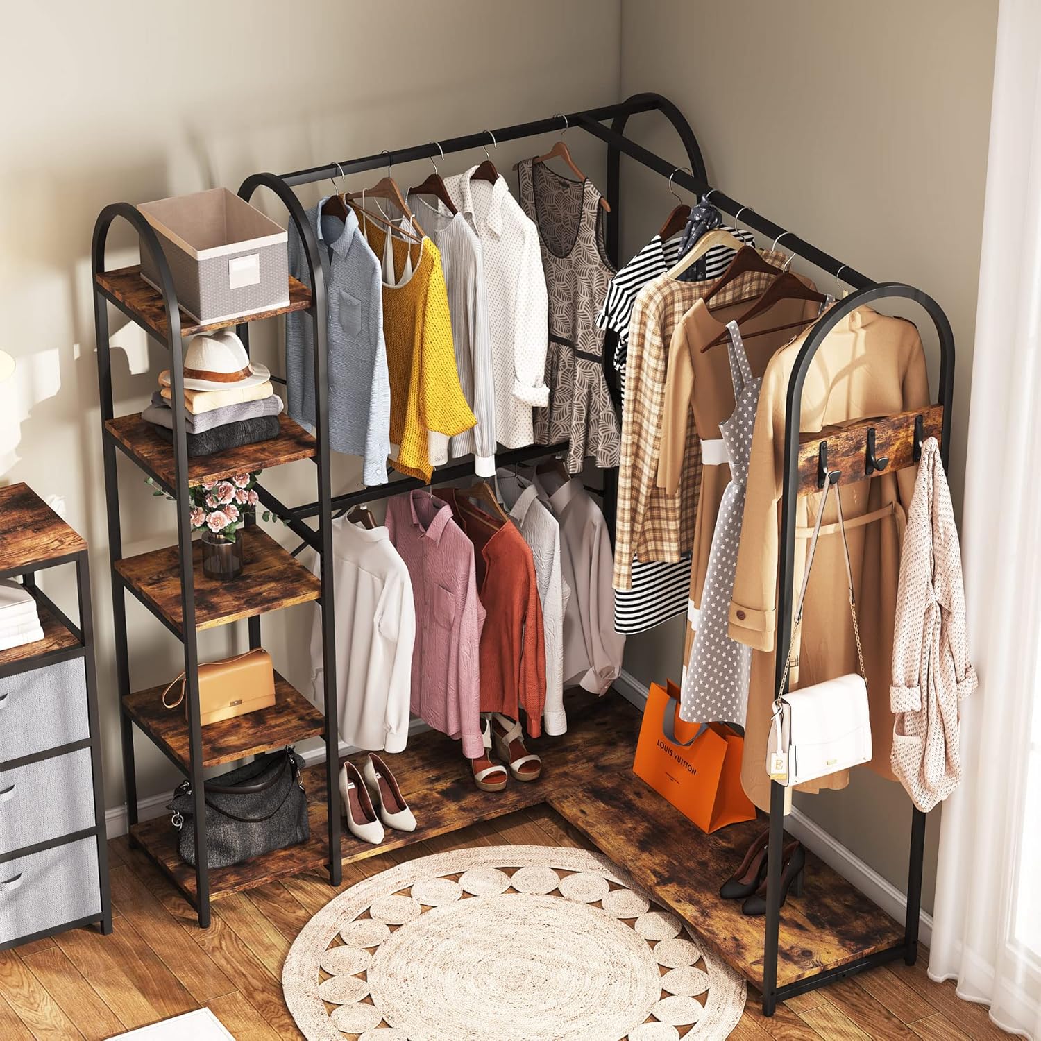 Tribesigns L Shape Clothes Rack, Corner Garment Rack with Storage Shelves and Hanging Rods, Space-Saving Large Open Wardrobe Closet for Bedroom