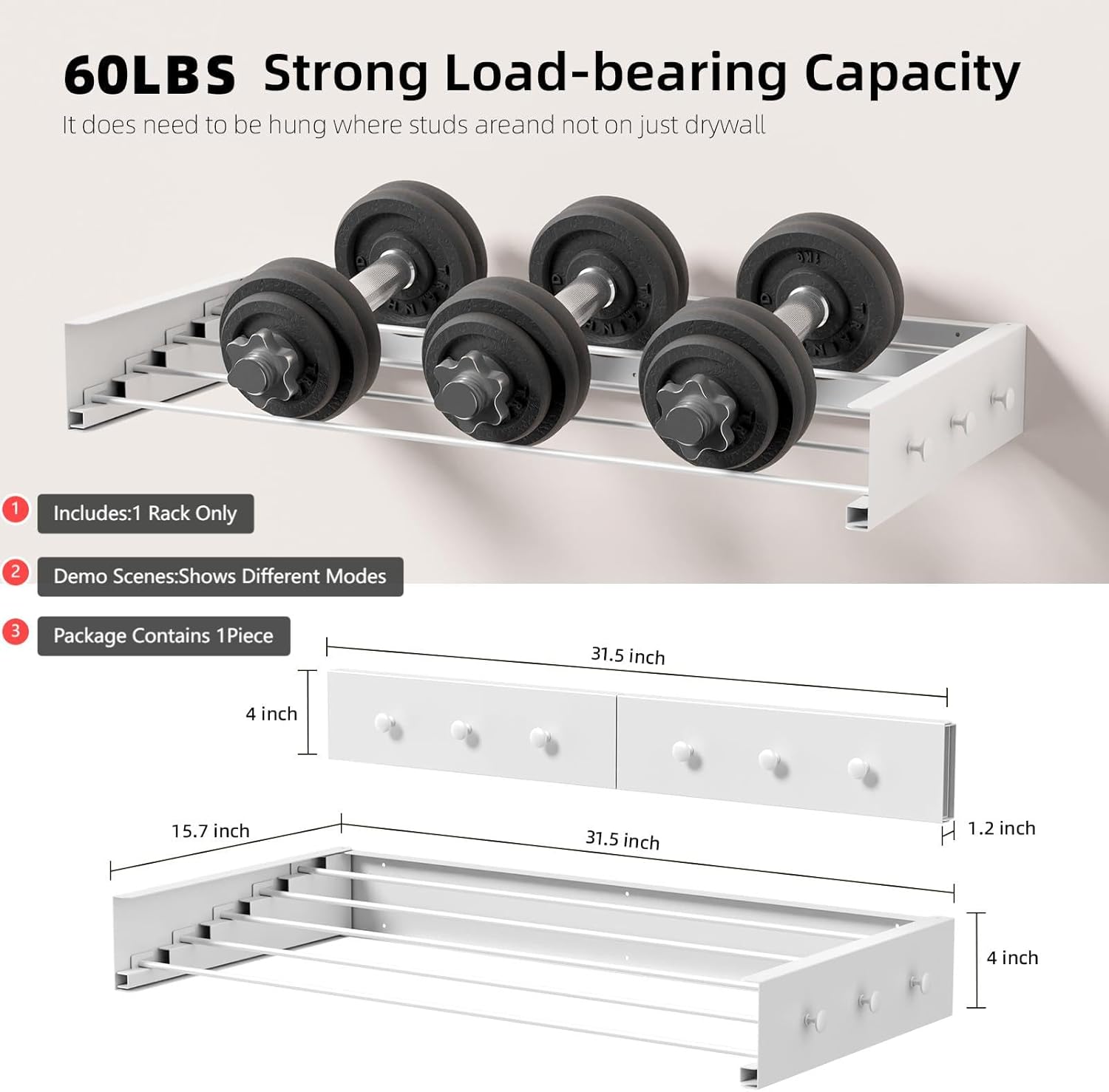 Upgrade Laundry Drying Rack, 31.5" Drying Rack Clothing Wall Mounted,Foldable, 5 Aluminum Rods with 6 Hooks, Space-Saving White Collapsible Drying Racks Hanger for Laundry Bathroom
