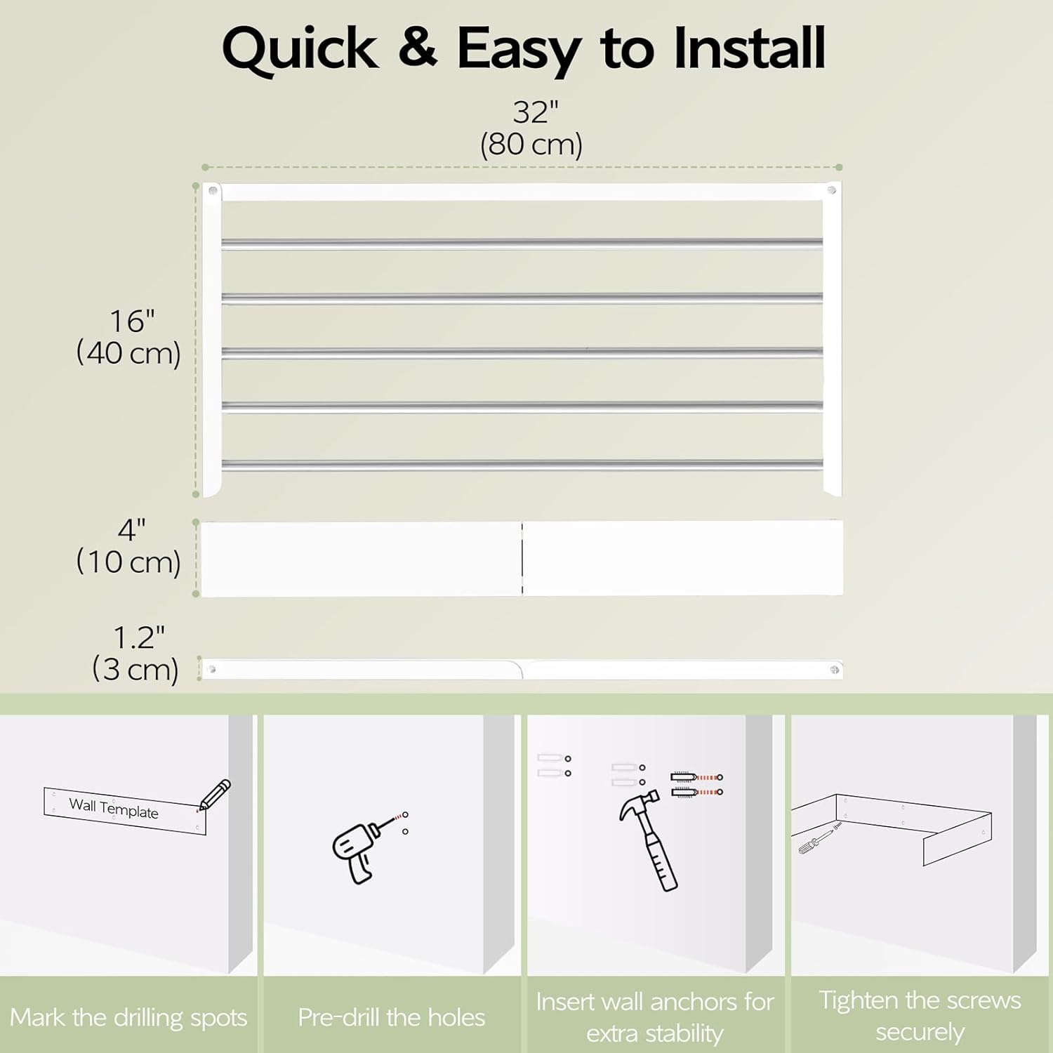 Wall Mounted Clothes Drying Rack 32", Foldable Wall Mount Laundry Rack Folding Indoor, Drying Rack Clothing Collapsible, Hidden Space Saver with Wall Template, 5 Rods, White